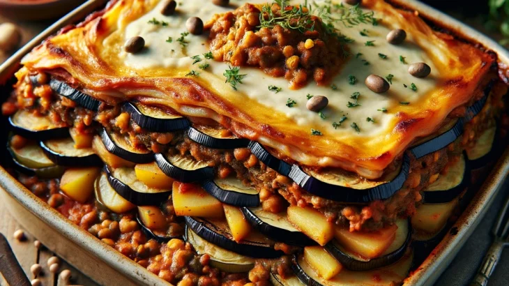 Moussaka vegană este o reinterpretare a clasicului fel de mâncare grecesc, înlocuind carnea cu un amestec bogat de linte și roșii, și stratul de beșamel cu o variantă vegană. Această versiune menține esența și aromele tradiționale, oferind o alternativă sățioasă și reconfortantă.
