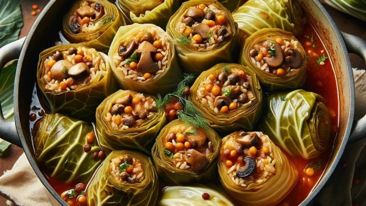 Sarmalele vegane în foi de varză reprezintă o variantă plină de gust și sănătoasă a tradiționalului preparat est-european. Umplutura este o combinație nutritivă de orez, ciuperci, linte și legume tocate fin, totul aromatizat cu ierburi și condimente, învelite în foi de varză și gătite lent într-un sos de roșii bogat.